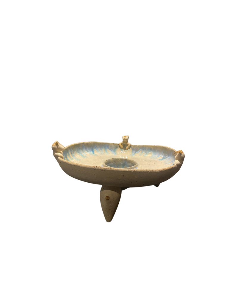 Técnica: Trabajo manual. plato grande y cuenco pequeño s etrabajan en moldes de presion y luego se juntan. las patas son MAMIFORMES, hechas a mano con texnica de modelado. pieza compleja. guardianes son esculruas hechas cada una manual.